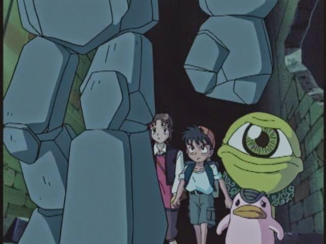 Everyone screams, but Genki recognizes the Monster. "A Golem!"